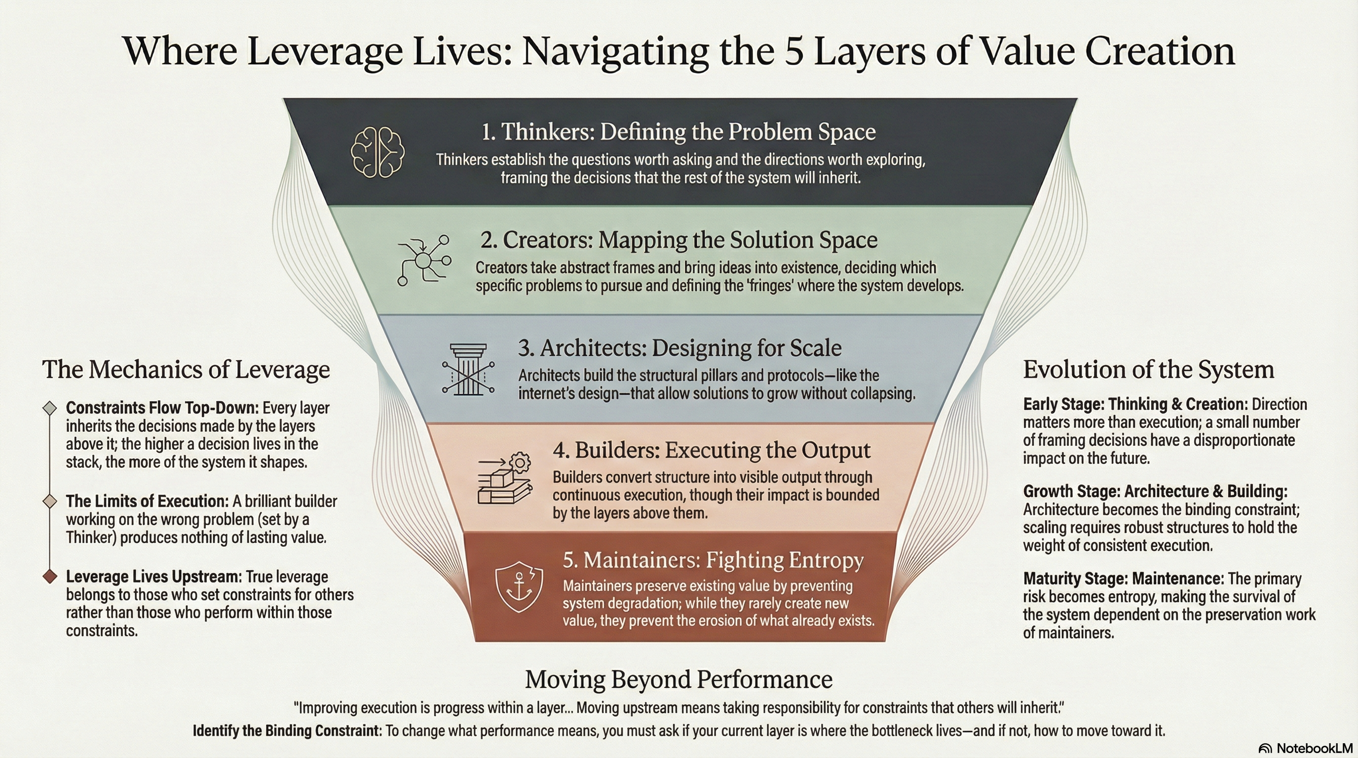Improving execution is progress within a layer. The question isn’t just “How do I get better at my current layer?” It’s also: Is my current layer where the binding constraint lives? And if not: What would it mean to move towards it? Moving upstream is different: it means taking responsibility for constraints that others will inherit. Which means shaping the conditions, not merely performing inside them.
